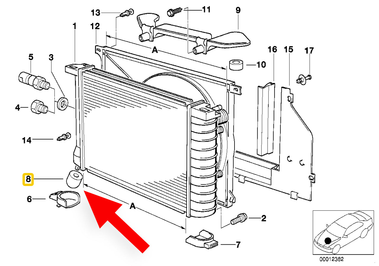 A radiator mount is a support component that secures the radiator to the vehicle's frame or body. It typically consists of rubber or plastic brackets or isolators designed to dampen vibrations and help keep the radiator properly positioned to facilitate efficient cooling. Proper mounting is essential for maintaining the alignment of the radiator with the engine and the cooling system.