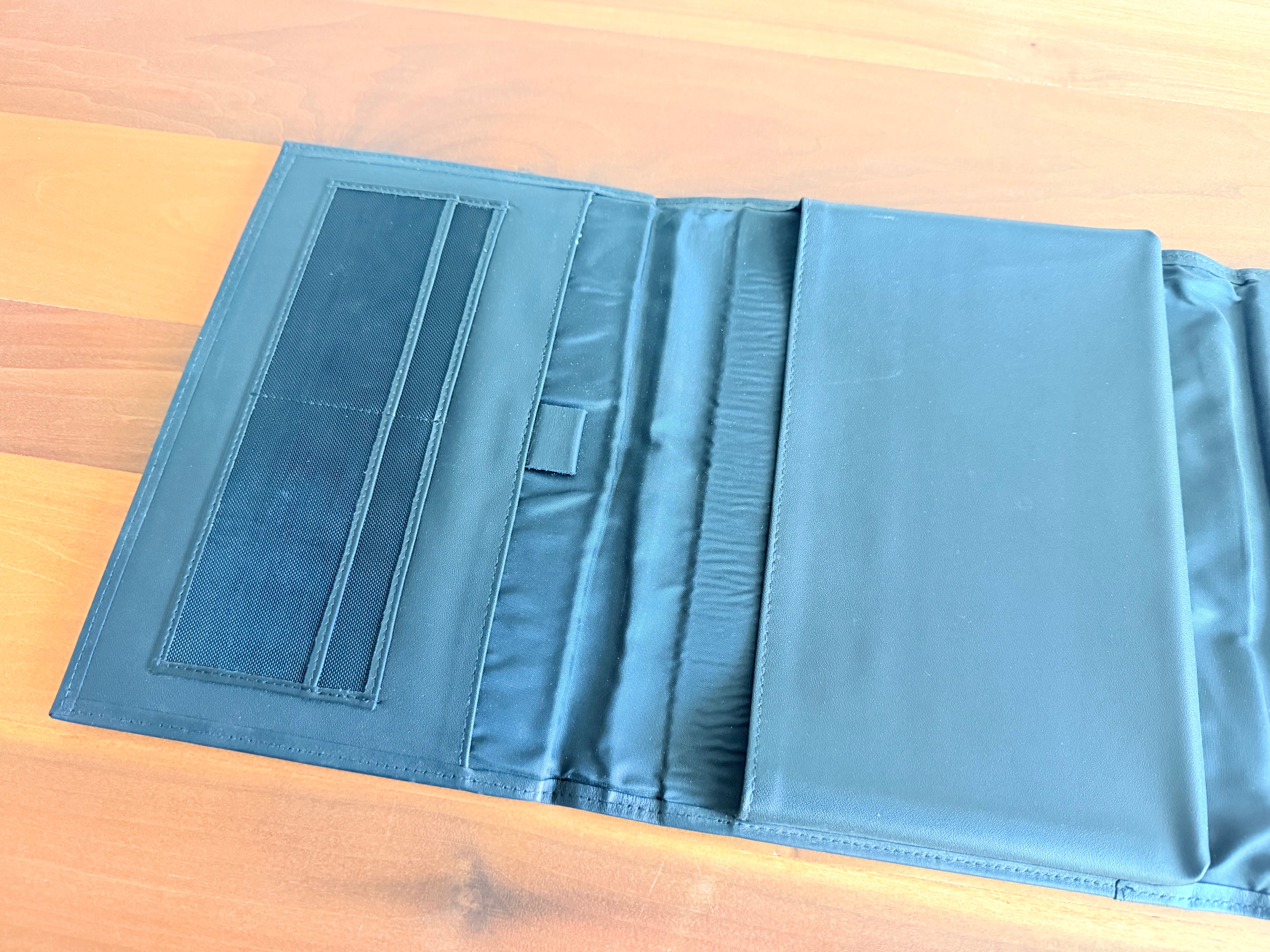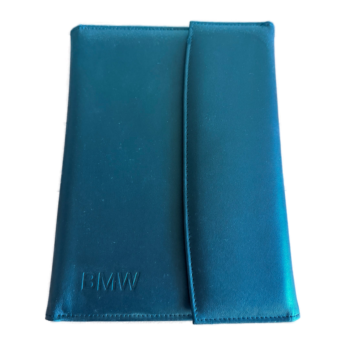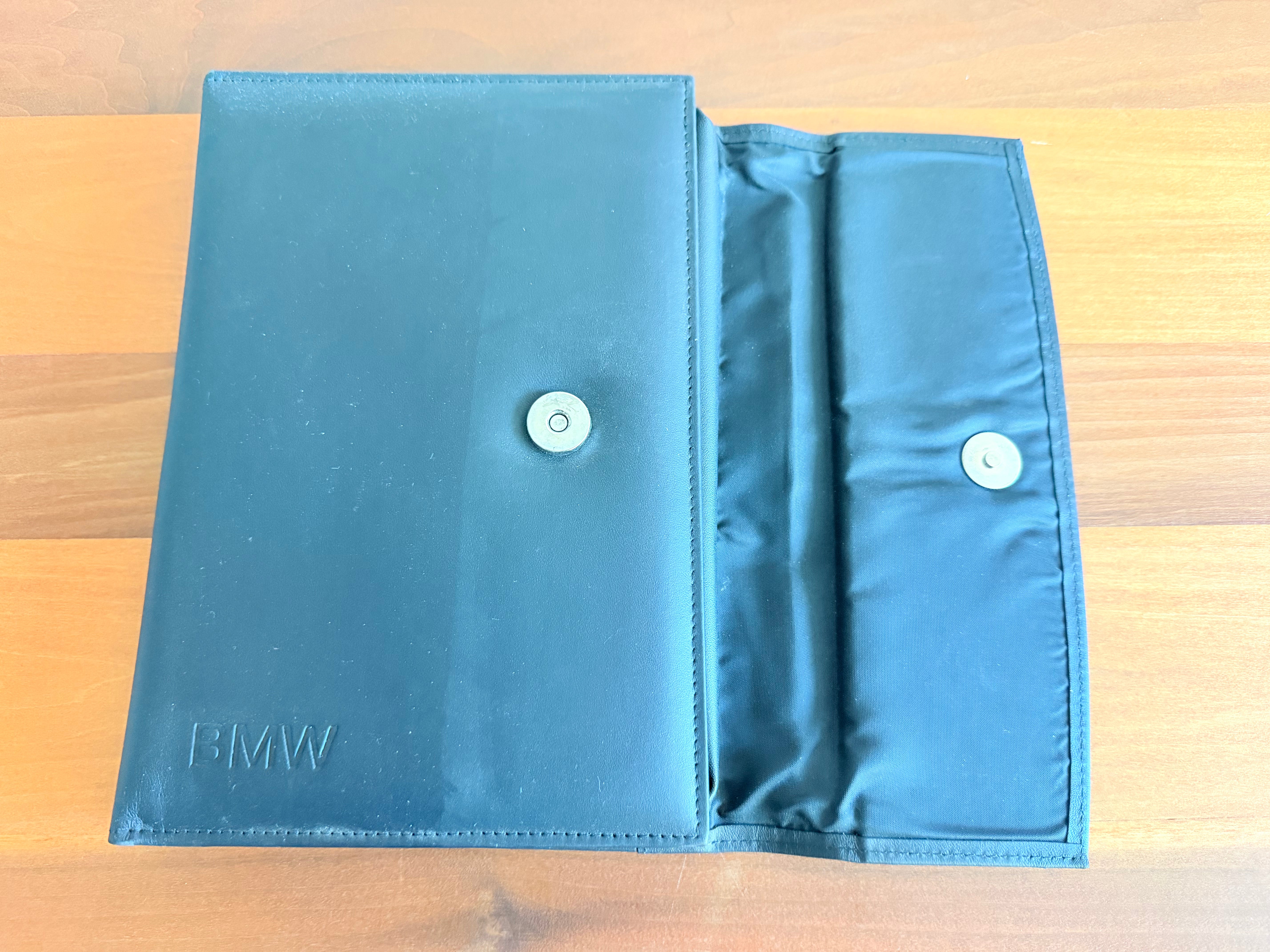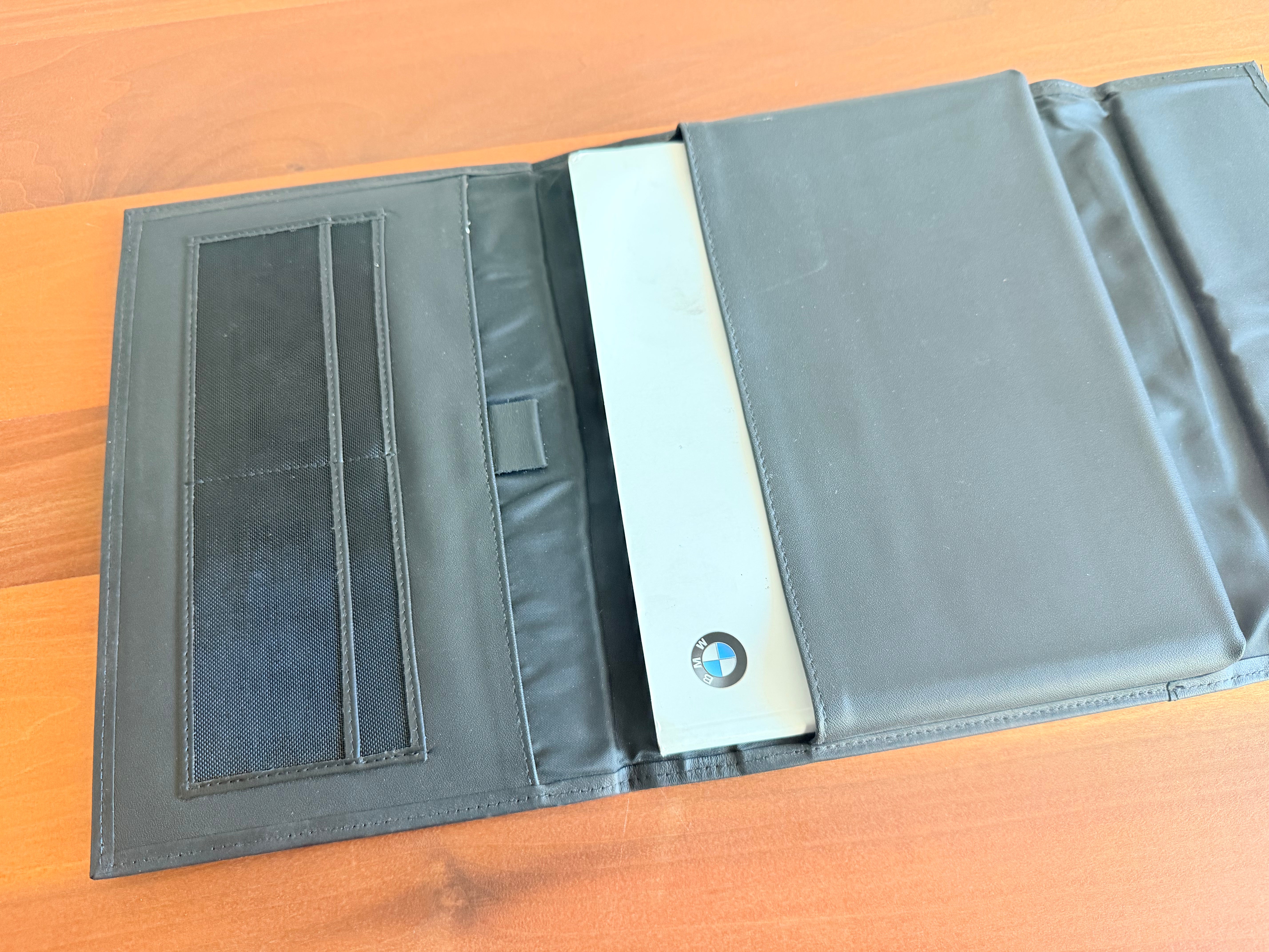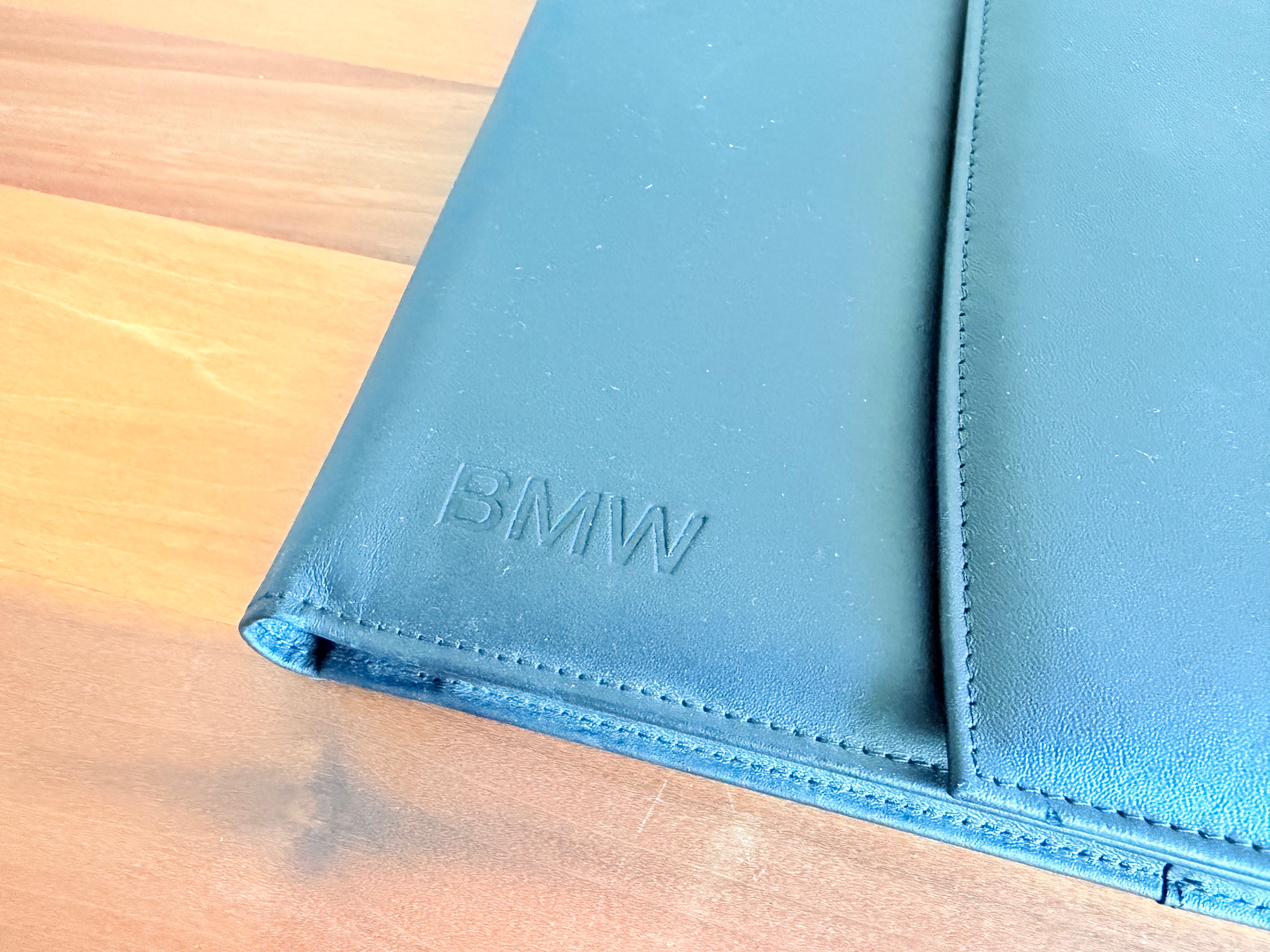 Original BMW owner's manual case with embossed BMW logo on front. This is a magnetic close, bi-fold, design. It holds owner's manuals, service documents, vehicle registration, etc.