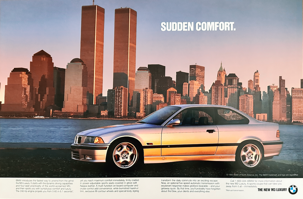"Sudden Comfort. BMW introduces the fastest way to unwind from the grind: the M3 Luxury." Features the BMW E36 M3 Coupe Luxury package across from to the twin towers in downtown Manhattan, New York.