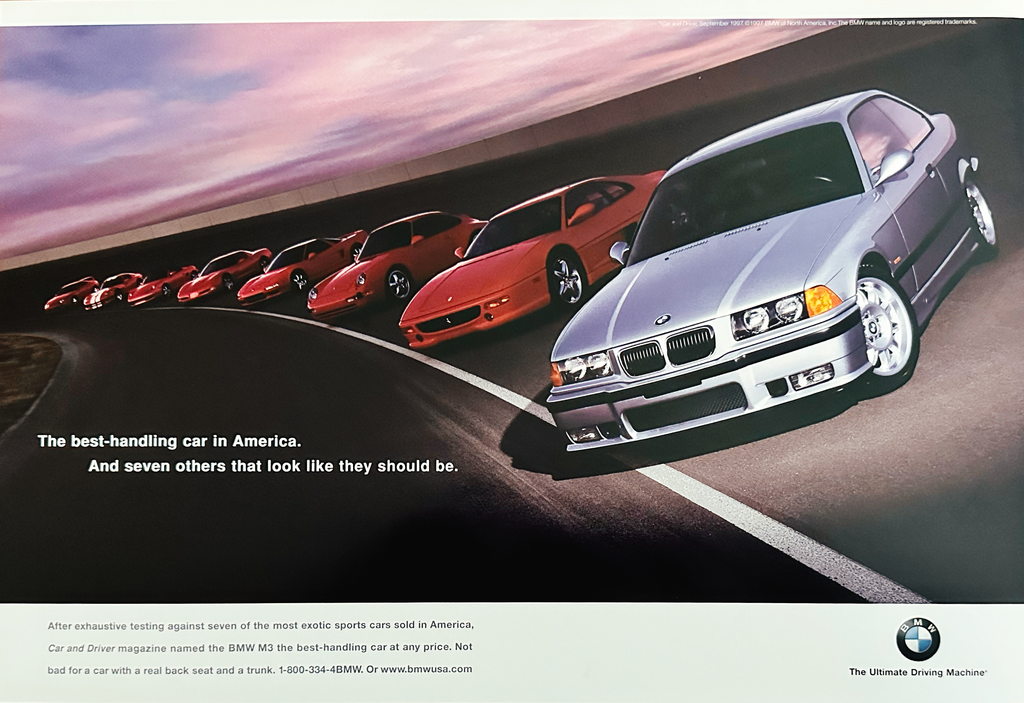 "The best-handling car in America. And seven others that look like they should be. After exhausting testing against seven of the most exotic sports cars sold in America, Car and Driver magazine named the BMW M3 the best-handling car at any price. Not bad for a car with a real back seat and trunk."
