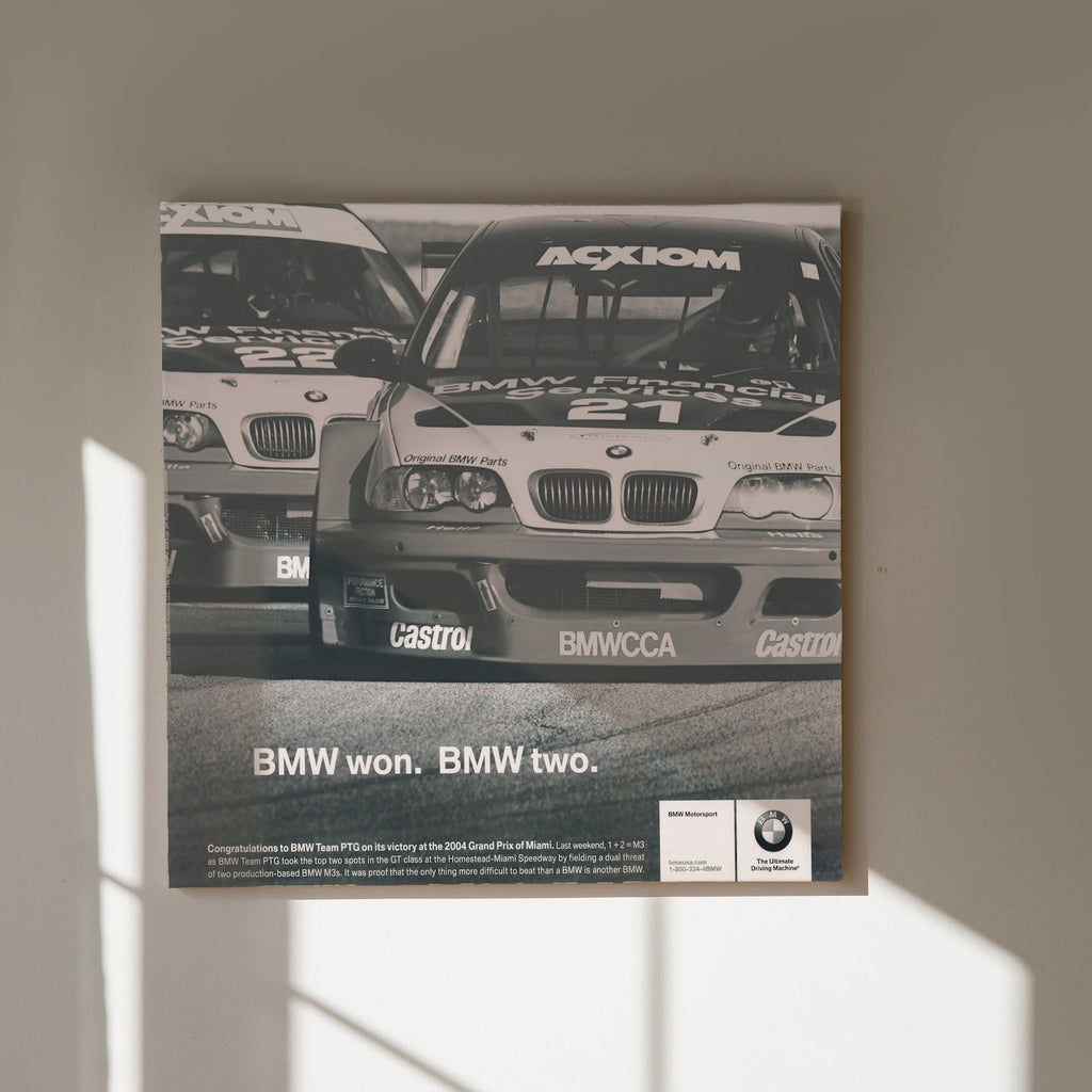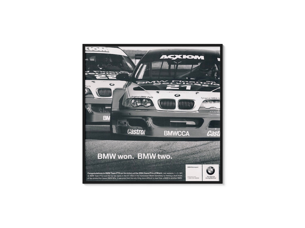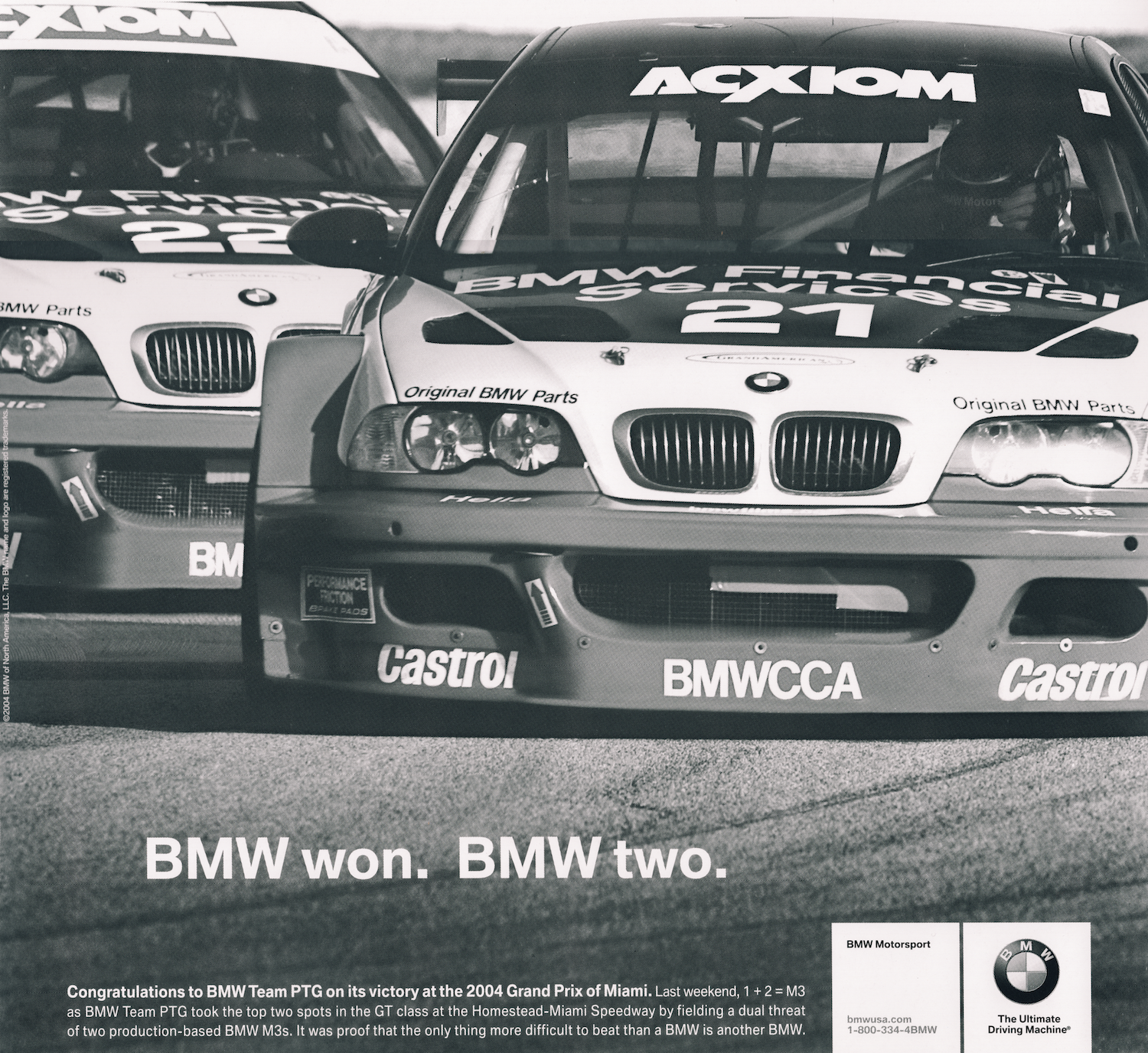 "Congratulations to BMW Team PTG on its victory at the 2004 Grand Prix of Miami. Last weekend, 1 + 2 = M3 as BMW Team PTG took the top two spots in the GT class at the Homestead-Miami Speedway by fielding a duel threat of two production-based BMW M3s. It was proof that the only thing more difficult to beat than BMW is another BMW."