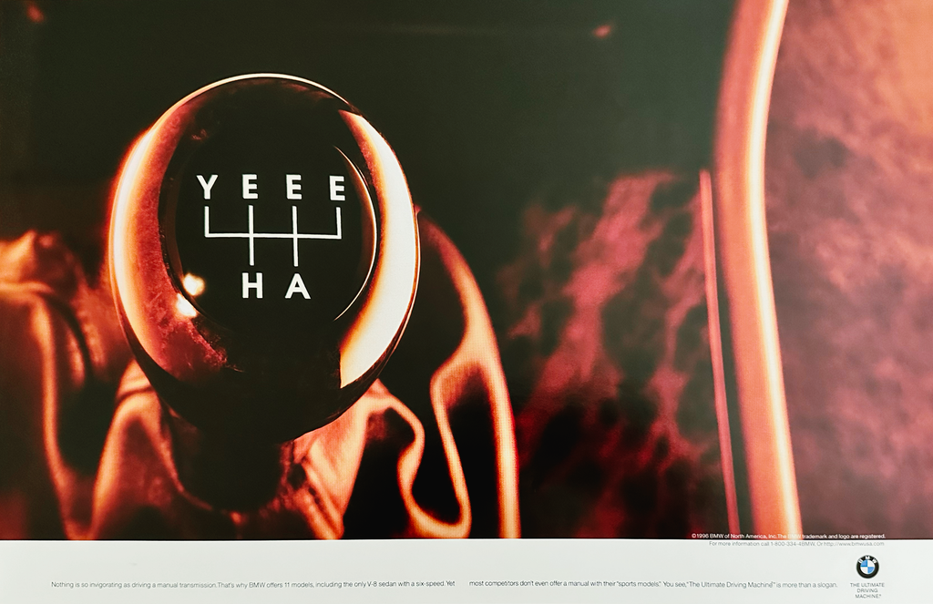 "Nothing is so invigorating as driving a manual transmission. That's why BMW offers 11 models, including the only V-8 sedan with a six speed. Yet most competitors don't even offer a manual with their "sports models". You see, "the Ultimate Driving Machine" is more than a slogan."