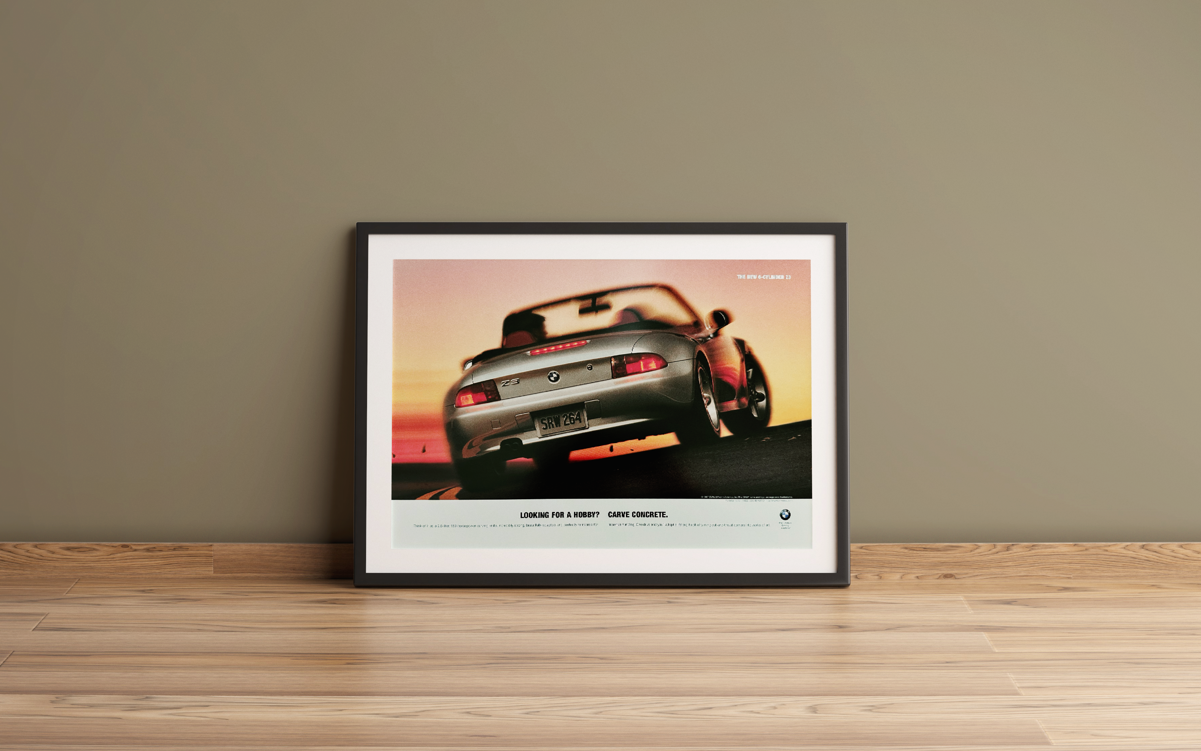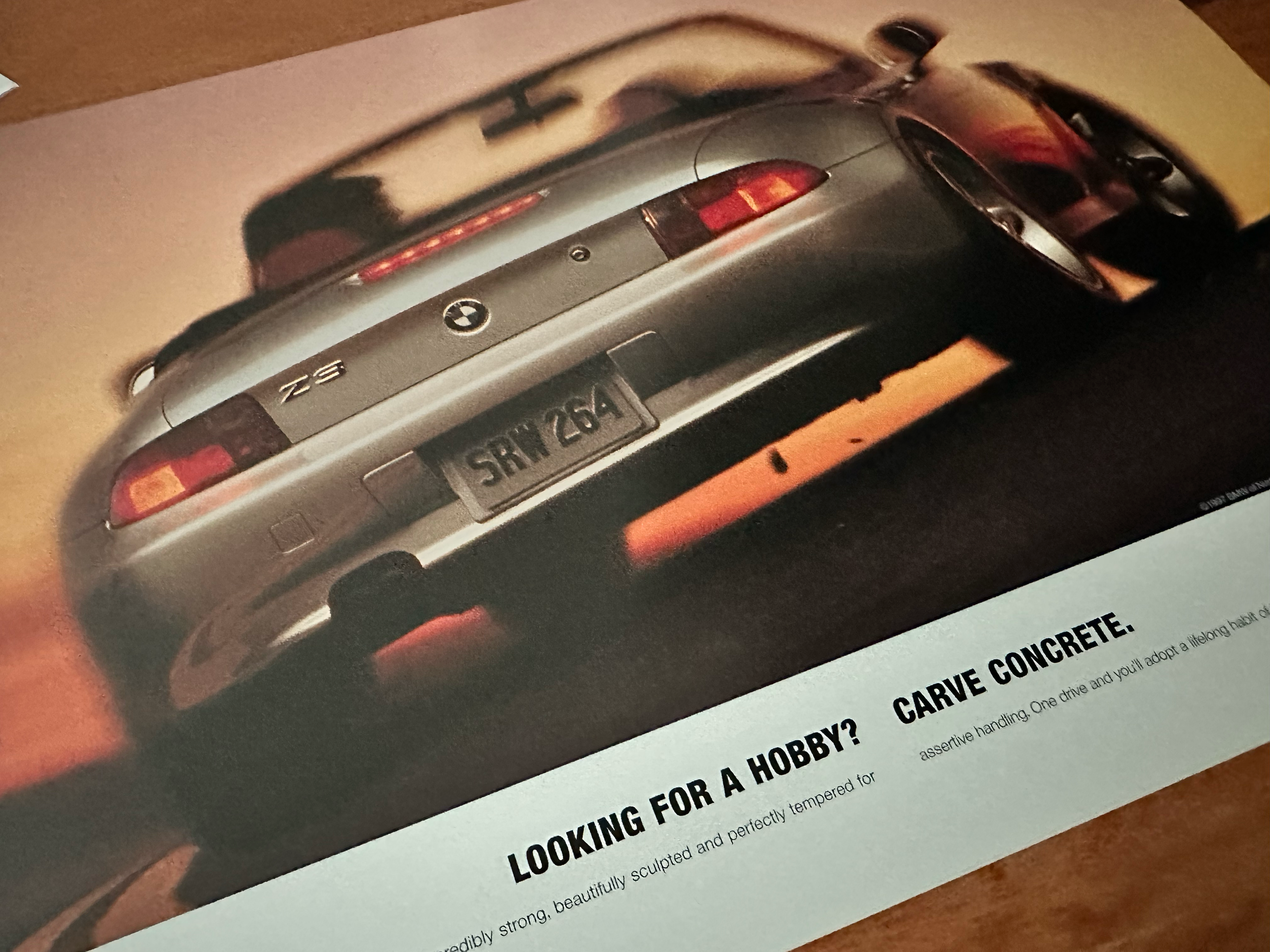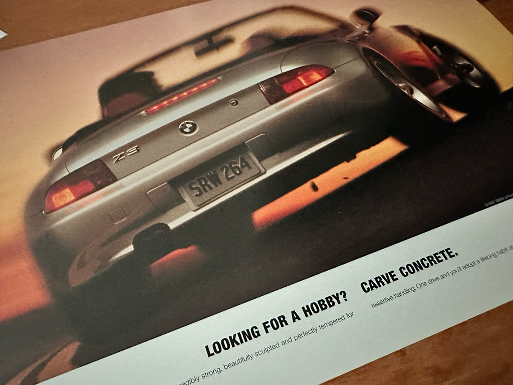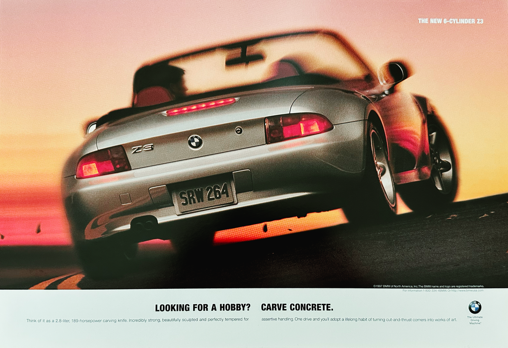 "Looking for a hobby? Carve concrete. Think of our 2.8 liter, 189 horsepower carving knife. Incredibly strong, beautifully sculpted and perfectly tempered for assertive handling. One drive and you'll adopt a lifelong habit of turning cut and thrust corners into works of art."