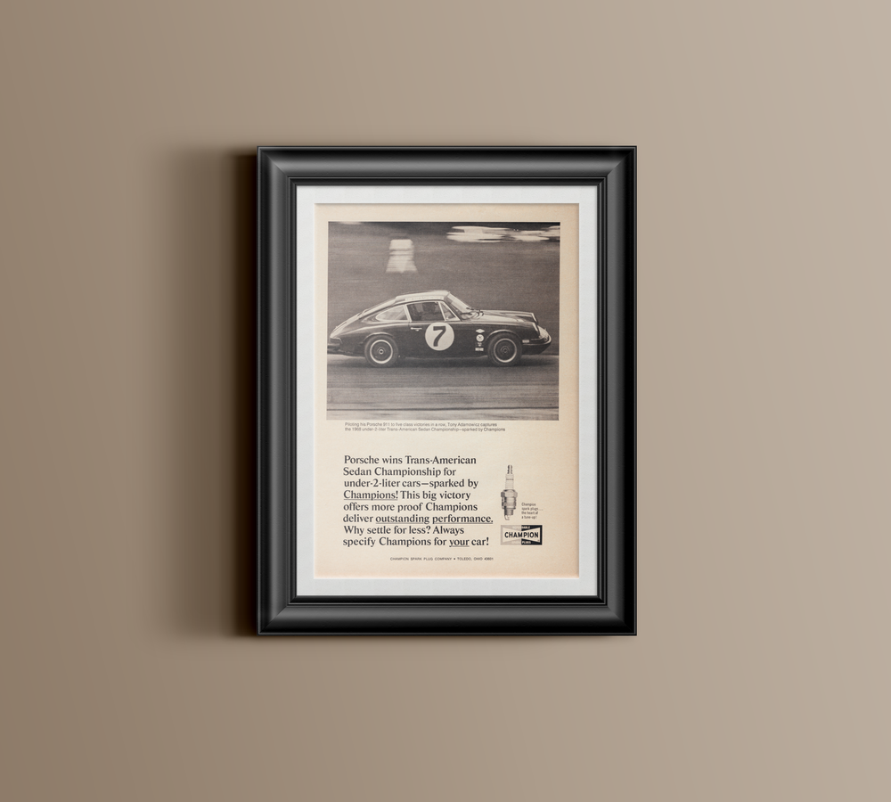 Original print, vintage Porsche 911 Champion Spark Plugs magazine advertisement from 1973.